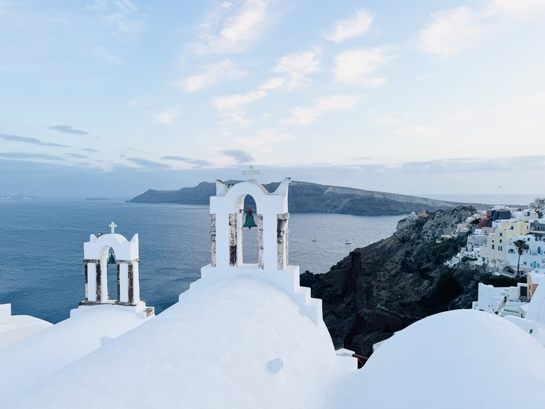 有點不巧的是,我們搭飛機抵達聖托里尼的時候,還是略略有點飄雨,隔天雲層依舊有點厚,連帶著愛琴海都灰灰的,但我們還是能從偶爾露臉的藍天間隙中,捕捉聖托里尼的美