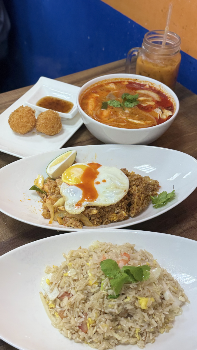 泰樂泰式料理 在這間泰式餐廳,每一道料理都像是把泰國街頭的熱情與香氣完整搬來眼前。他是不能訂位的喔 !只能現場排隊! 濃郁的冬蔭功湯,酸辣鮮明,香茅與南薑的層次在舌尖跳舞,完美開啟味蕾。搭配旁邊酥脆的炸球點心,外酥內嫩,沾點特製醬汁更是一絕。 炒飯部分也不馬虎。第一道帶著紅咖哩香氣的炒飯,上頭放上一顆煎得恰到好處的太陽蛋,蛋黃流淌與香辣米飯融合,每一口都讓人停不下來。另一道則是泰式經典蝦仁炒飯,粒粒分明、鹹香適中,爽口不膩,是炎熱天氣裡的清爽選擇。 整體來說,這是一頓色香味俱全、讓人回味無窮的泰式饗宴,無論是想要重口味刺激還是輕盈爽口的選擇,這裡通通都能滿足。