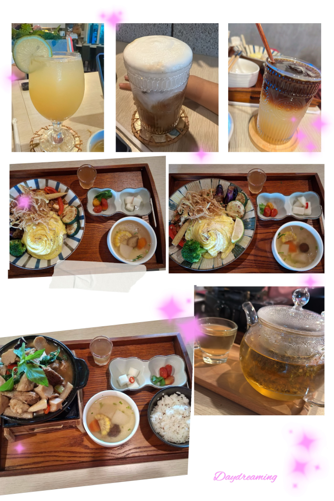 因為家人吃素食料理想說母親節找了這間附近的素食餐廳 跟以往的素食不太一樣 我們這次點的餐點有: 檸檬馬鞭花茶(下右圖) 三杯菇煲飯 (下左圖) 佛手柑柚子茶(上左圖) 泰式打拋飯(中左圖) 麻婆豆腐(中右圖) 冰柚香美式(上右圖) 鮮奶茶(上中圖) 這裡餐廳採預約制 預約後都需預付訂金 整體環境都很乾淨 老闆娘服務態度也都很親切 有喜歡的朋友也可以來吃看看☺️ 因為我已經來了第二次到這裡聚餐 我之後聚餐還是會來🤣因為潮州附近真的沒有什麼素食餐廳可以聚餐🥺