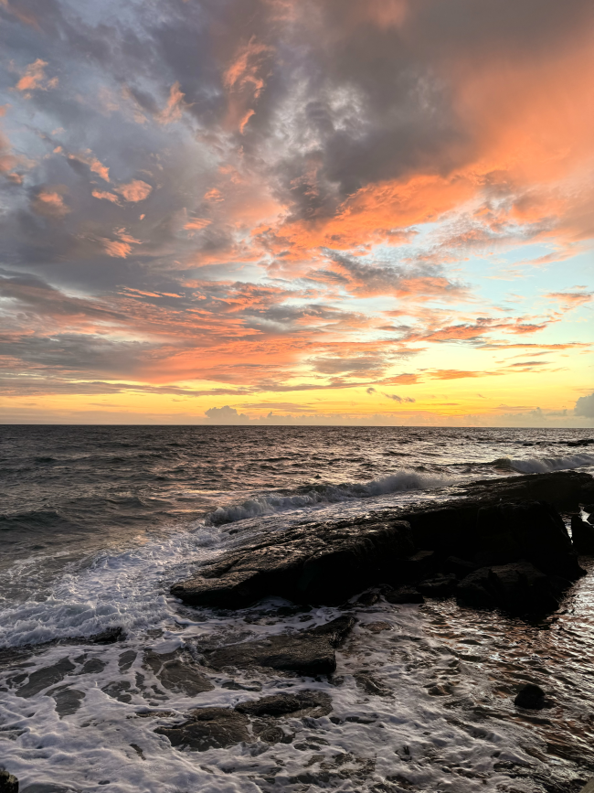 天空從湛藍逐漸暈染開來,橘紅、粉紫、金黃交織成一幅絢爛的畫作