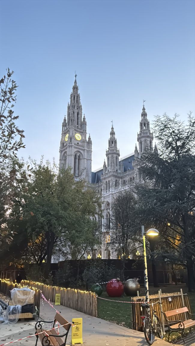 第一次踏上維也納這座音樂與藝術之都,心中滿是期待與悸動。 眼前這座哥德式建築,氣勢磅礡,仿佛是從童話故事中走出來的城堡,一眼就讓我驚艷。 夕陽餘暉灑落在建築上,讓白色石牆透出一層柔和的金光,而鐘樓上的時鐘也剛好亮起,時間彷彿在這裡放慢了腳步。周圍被裝飾得像聖誕市集預備場,有燈串、小木柵、還有幾顆巨大的聖誕球點綴其中,為這座莊嚴的建築增添了一絲童趣與溫暖的節慶氣息。 坐在市政廳前的小公園長椅上,聽著風穿過樹梢的聲音,我感受到一種久違的平靜與浪漫。這裡不只是觀光客聚集的打卡熱點,更是一個可以真正慢下來、用心感受歐洲生活步調的地方。 維也納,是一座懂得如何結合歷史與現代、莊嚴與溫馨的城市。而這座市政廳,正是它最迷人的縮影。