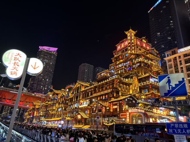重慶的洪崖洞是一個建在崖壁上的吊腳樓建築,晚上的夜景非常美。