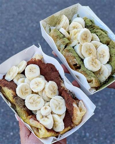 我點了一份香蕉煎餅,只見老闆俐落地把麵糰甩得又薄又大,放上切片香蕉,煎得金黃酥脆,再豪邁地淋上煉乳和巧克力醬。