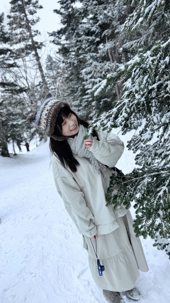 嘴裡不停的「哇~」,手也忍不住的去玩落在樹上的雪花❄️,笑得像小時候一樣燦爛。