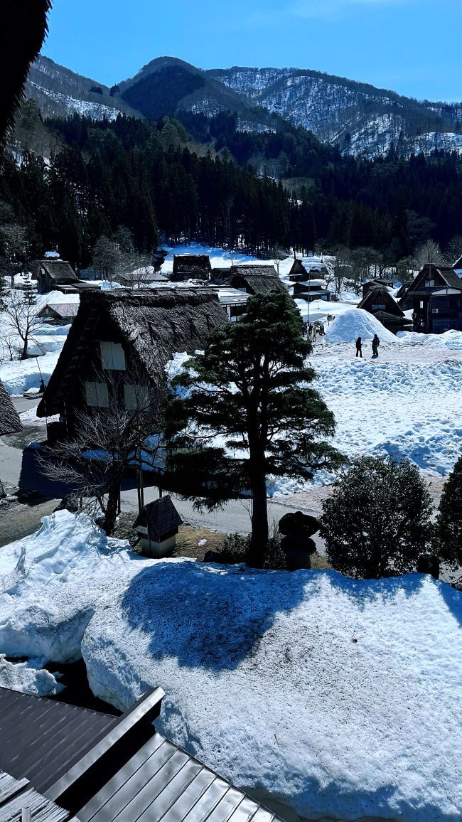 還記得第一次踏進合掌村,是一場下著雪的冬日☃️ 彷彿走進童話裡的世界,小木屋、煙囪、白雪靜靜覆蓋屋頂,每一幕都像明信片。