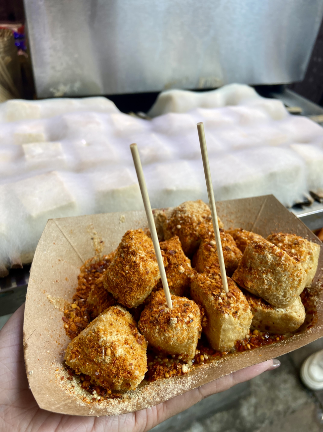 13香酥炸毛豆腐 毛豆腐,是中國安徽省徽州地區非常有特色的一種傳統發酵豆腐。它的最大特點是在豆腐表面長有一層白色的絨毛,看起來像發霉了,但其實是一種可食用的霉菌,毛豆腐是安全且可食用的。毛黴菌在發酵過程中不但不會產生毒素,還有助於豆腐風味的形成。主要是毛黴菌。這種發酵讓豆腐產生了獨特的風味與口感。 這是我在四川磁器口古鎮吃到的,將發酵長毛的毛豆腐,裹上粉或麵糊後炸至金黃酥脆,撒上店家特製的香料粉,其做法與炸豆腐類似,但毛豆腐本身經過發酵,具有獨特的風味 外酥內嫩,口感層次豐富,發酵後有類似起司(如藍紋乳酪)的獨特香味,喜歡起司、納豆、臭豆腐等發酵食品的人,可能會很喜歡毛豆腐的味道,不喜歡發酵味道或對黴菌敏感的人,可能會覺得氣味刺鼻、不易接受