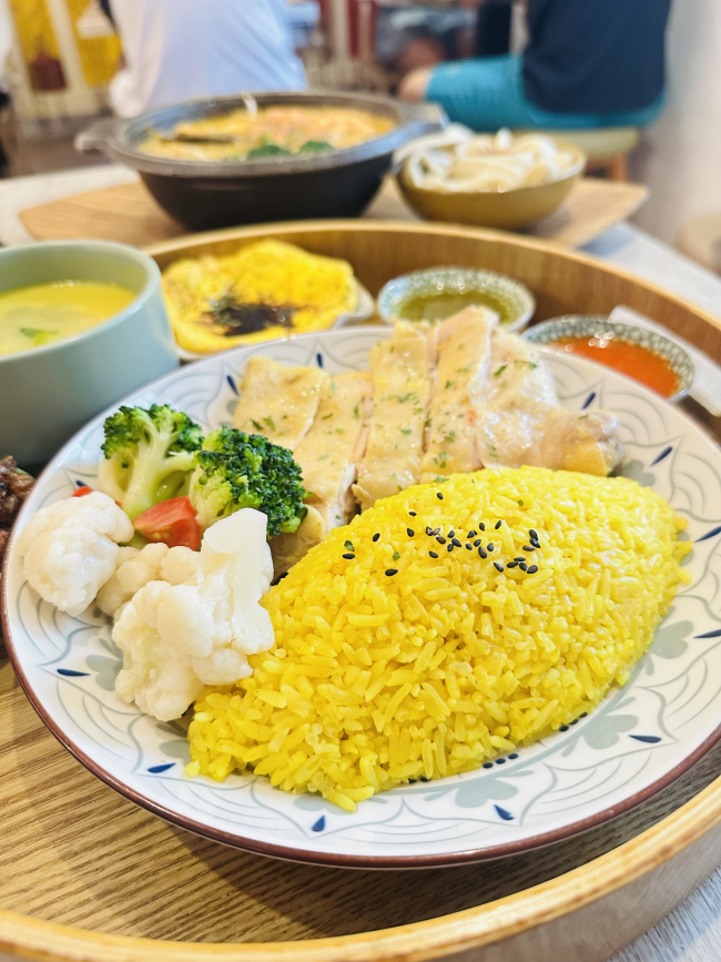 新竹豔麗南洋鹹甜食 海南雞飯 醬料配的很好吃一定要加醬料很有層次 薑黃飯也給的很足夠可以吃的很飽 最喜歡他的其中一個配菜小魚干花生糖超級好吃 走之前還買了一罐回去嗑超級推薦👍🏻👍🏻