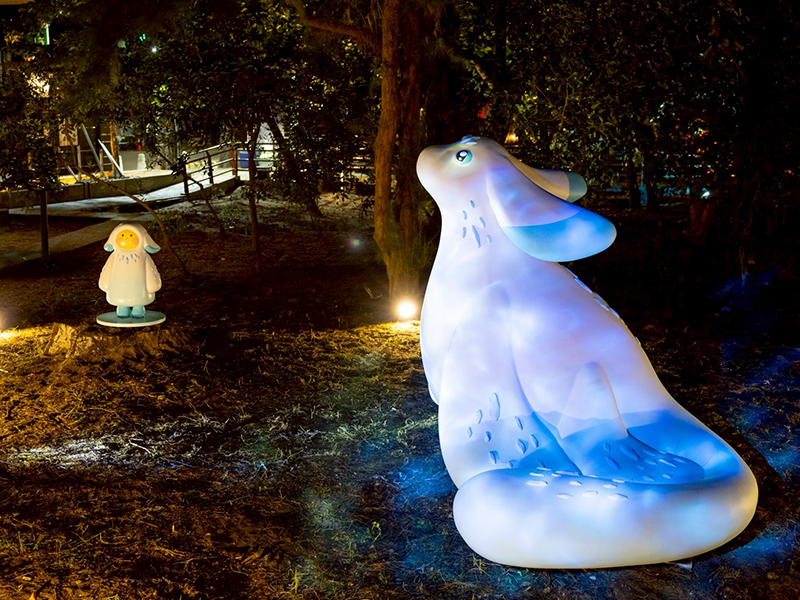《光與海的相遇》不僅是一件裝置藝術,更是一段溫柔的故事。作品主角「波波」是來自深海的守護神獸,象徵著海洋的力量與包容;「小光」則代表人類的好奇與學習。透過他們的相遇,傳遞「理解自然、尊重生命」的核心精神。展覽以光影雕塑與互動設計打造出奇幻氛圍,讓觀眾在體驗中重新認識海洋之美,也喚醒人類與環境共生的意識。